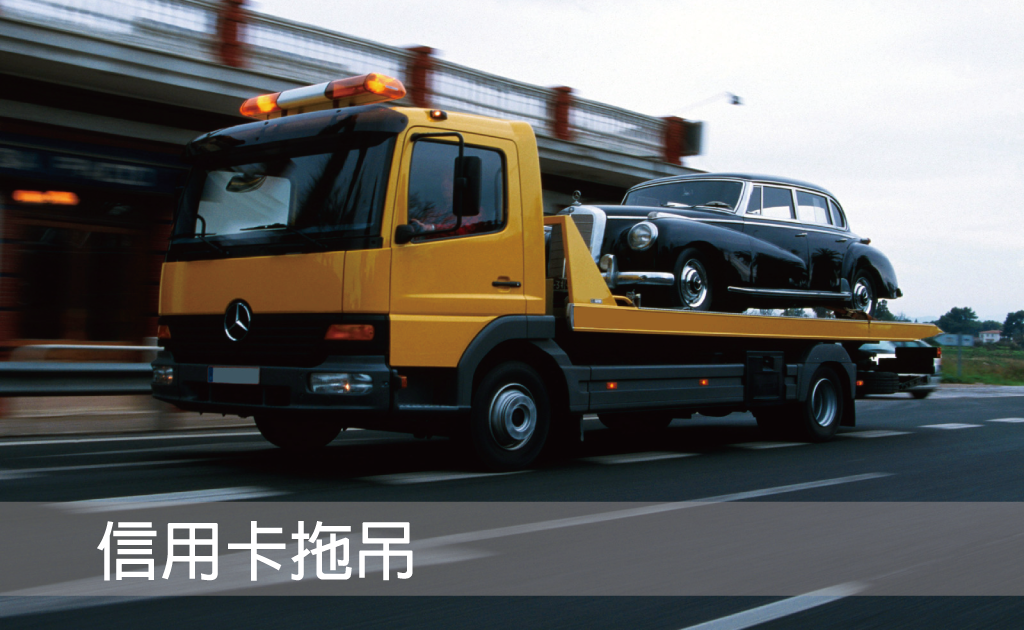 免費拖吊服務:汽車發生故障或事故致無法行駛時,提供自故障地點起平面拖吊50公里以內至持卡人指定車廠之免費拖吊服務。